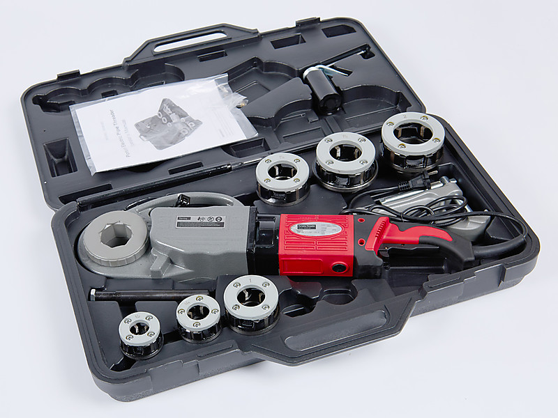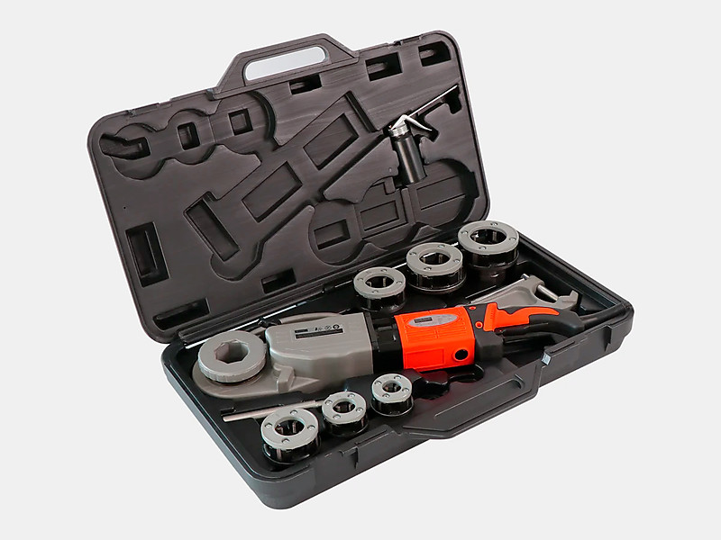 Клупп SQ30-2C оснащен полным набором резьбонарезных головок 11-R в диапазоне 1/2”-2” и опорным кронштейном, поставляется в прочном кейсе для переноски.